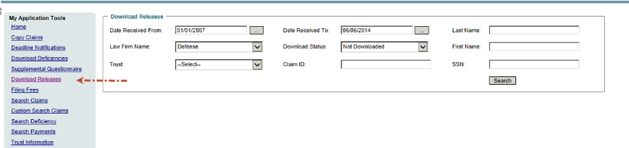 3) The Date Received From (i.e. the date you received the email notice that releases were available) field is defaulted to the inception date of the Trust and the Date Received To field is defaulted to the current date – you may change these dates to narrow the scope of your search.